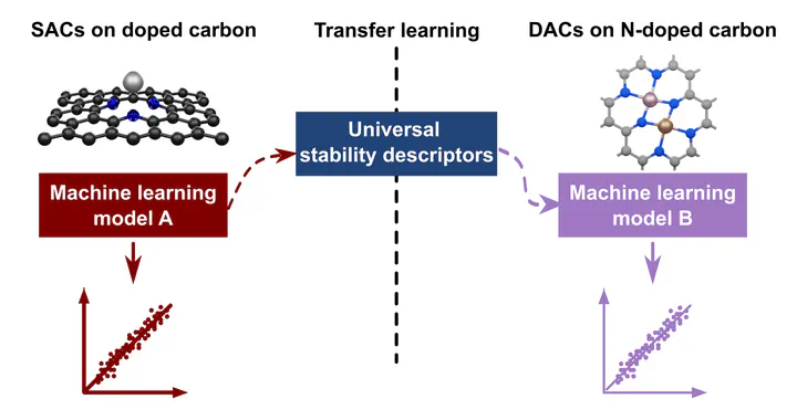 Dual-atom catalysts are innovative materials, with exceptional activity and selectivity. Yet, their stability remains a key challenge in catalyst design. Conventional characterization and synthesis techniques struggle to precisely identify active sites due to their vast configurations, while distinguishing the metal speciation remains challenging. In a theoretical approach, density functional theory based high-throughput screening is constrained by computational cost and time. Herein, we implemented transfer learning with domain knowledge adaptation for the evaluation of the stability against metal aggregation of DACs on nitrogen-doped carbon. The transferability of the stability descriptors applied to single-atoms on doped carbon to dual-atom catalysts on nitrogen-doped carbon, demonstrated their universality to more complex systems. Valuable insights were gained for the design of stable catalysts with the identification of the optimum metal pair and coordination environment combination, and the examination of stability–synergistic effect tradeoff.